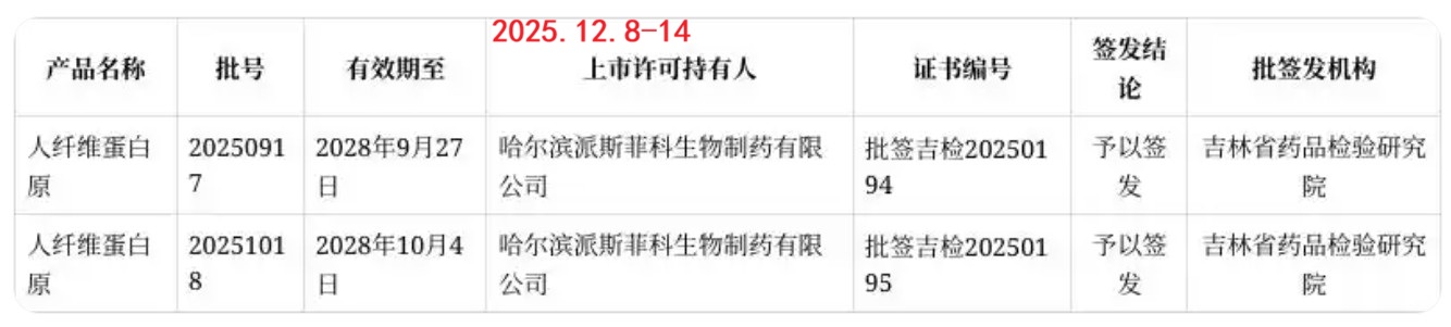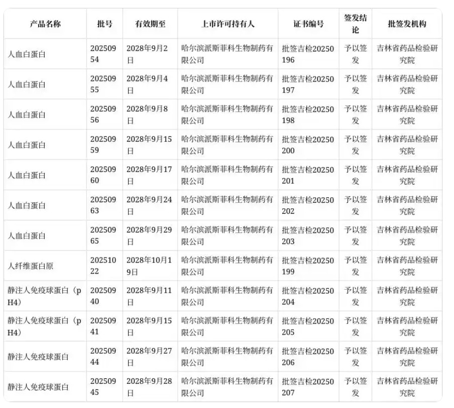 12月22日晚上消息,吉林省药品检验研究院披露的生物制品批签发产品公示数据显示:2025年12月15日至21日,吉林省药品检验研究院对哈尔滨派斯菲科生物制药有限公司7批次人血白蛋白予、2批次静注人免疫球蛋白、 2批次静注人免疫球蛋白(pH4)、1批次人纤维蛋白原予以签发。