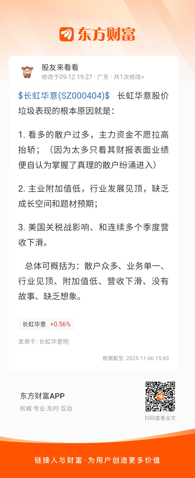 $长虹华意(SZ000404)$ 长虹华意股价垃圾表现的根本原因就是: