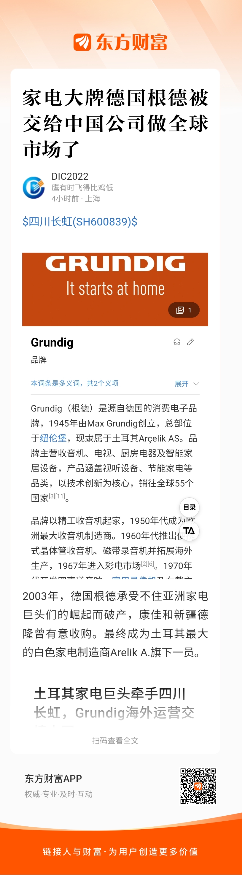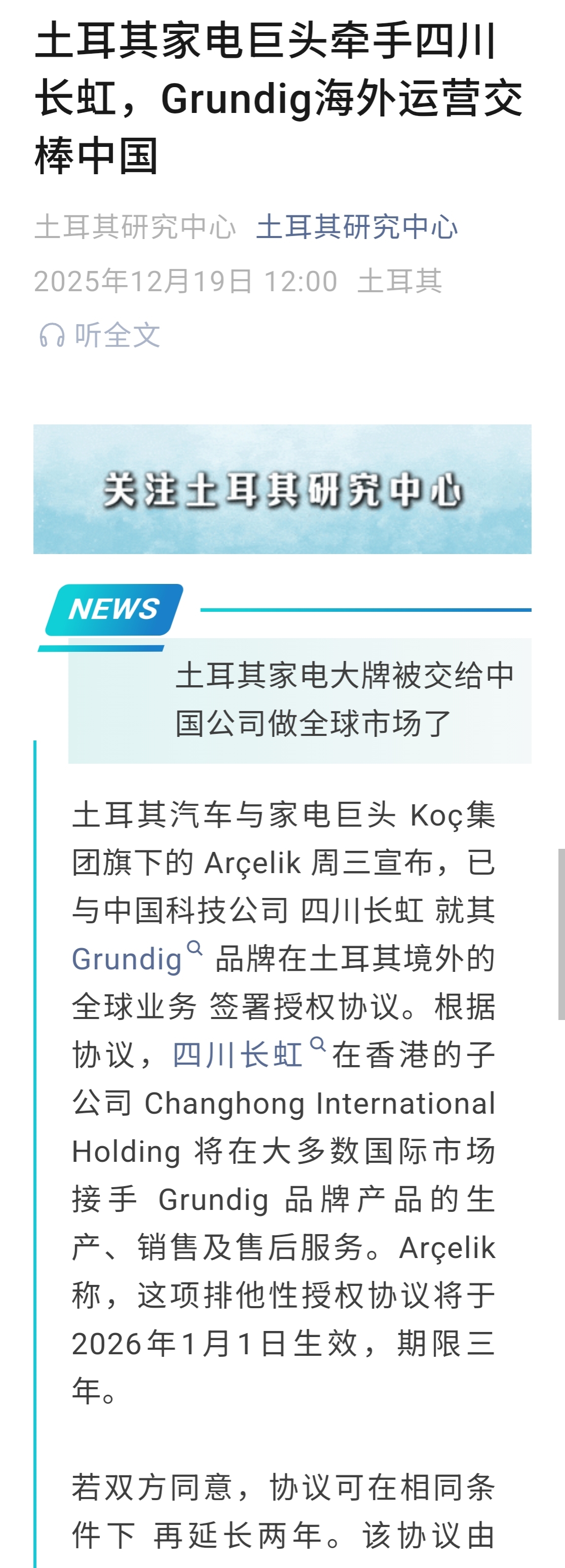 2026年1月1日开始,长虹将接手根德品牌在土耳其境外的全球业务,包括生产销售和售后。