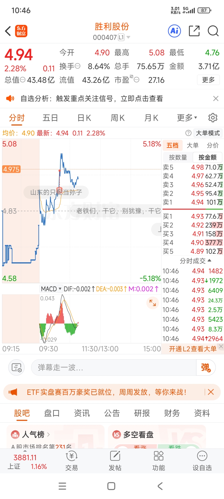 $胜利股份(SZ000407)$ 抱歉把你买崩了