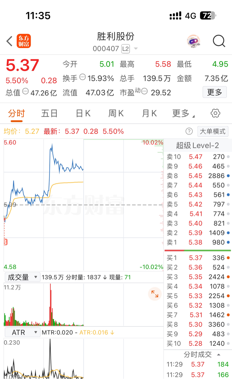 $胜利股份(SZ000407)$ 开盘4.96半仓,这票涨停的概率不大,只能跟随主力做差价,今天不管收盘几个点,明天盘中都会红三五个点