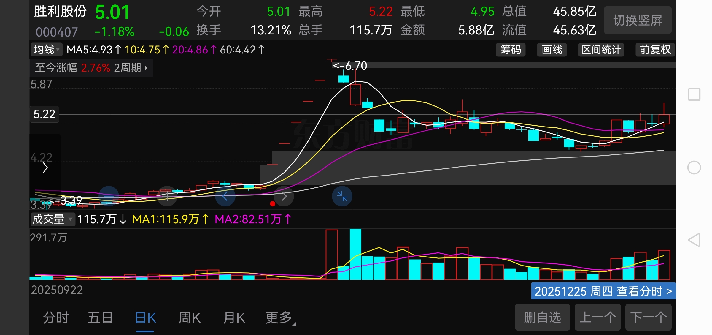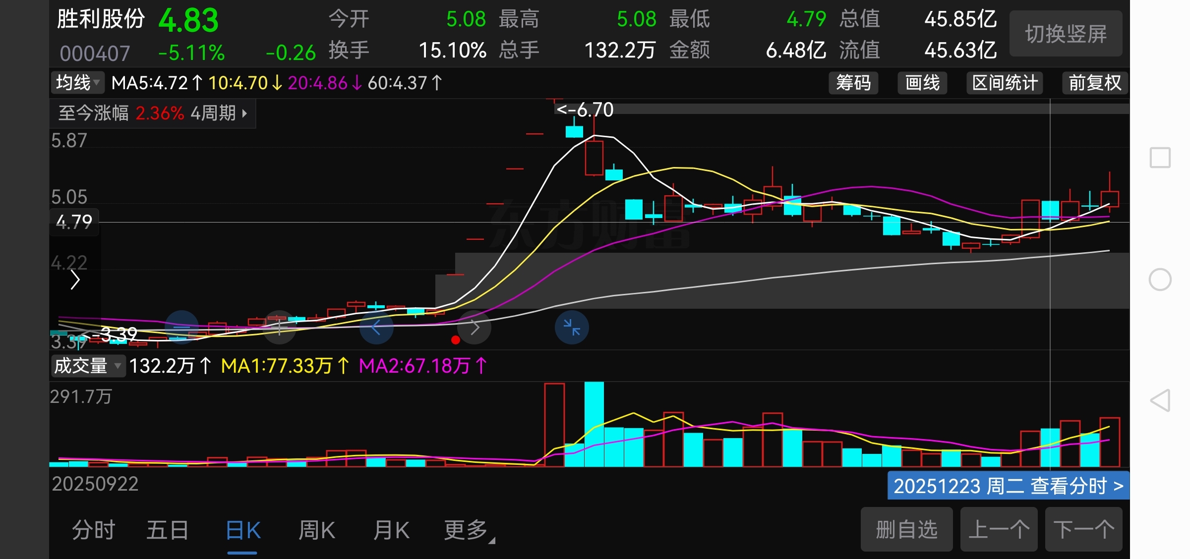 涨停高量阴,不破高量阴底4.79,阳线后的缩量阴,突破缩量阴高点5.22为买点。