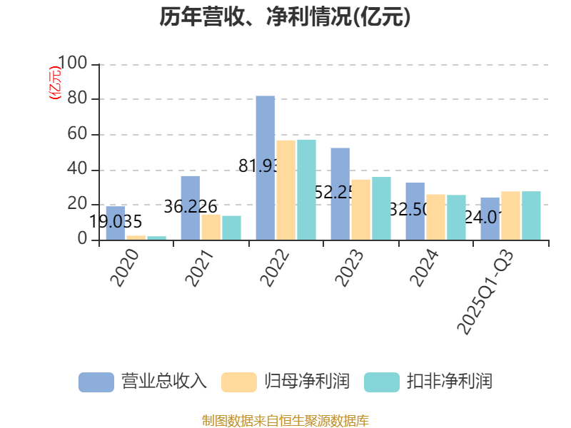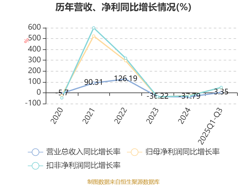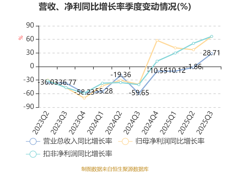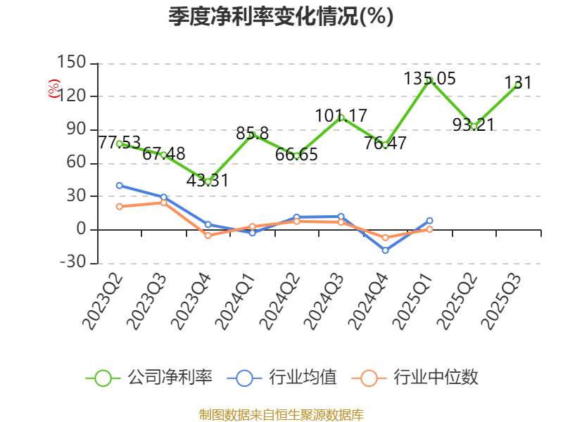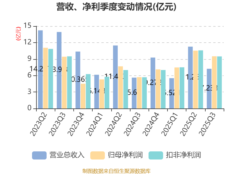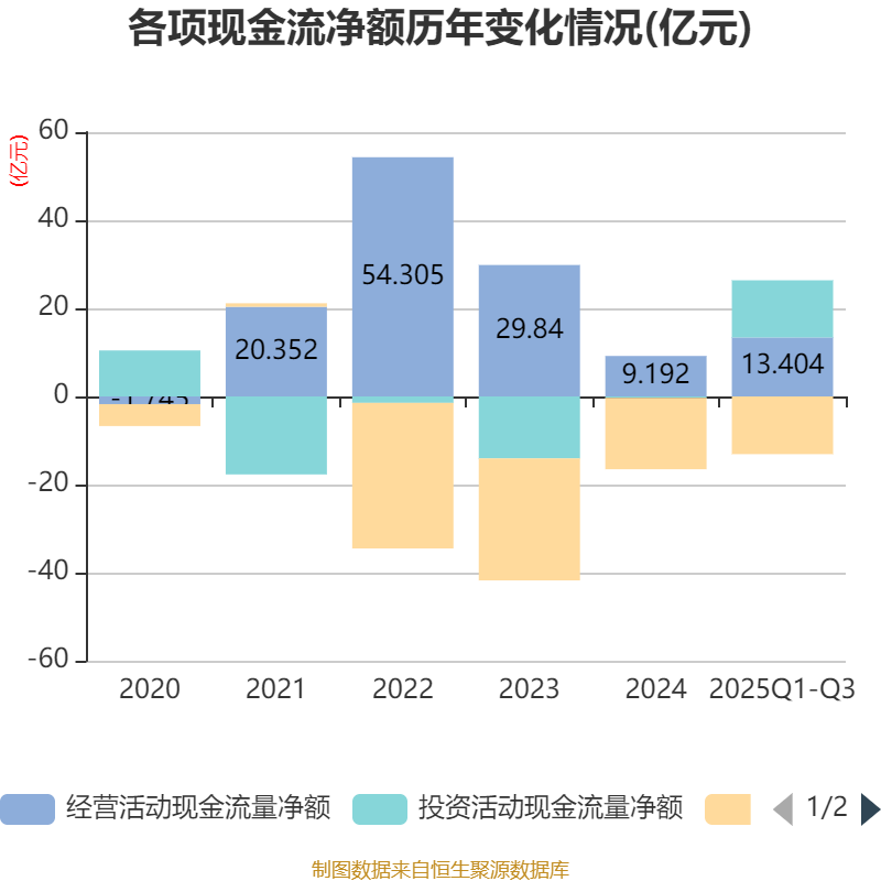 2025年前三季度,公司经营活动现金流净额为13.4亿元,同比增长118.88%;筹资活动现金流净额-13.1亿元,同比增加2.47亿元;投资活动现金流净额12.97亿元,上年同期为1.28亿元。