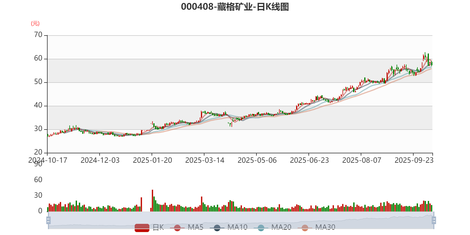 中证智能财讯藏格矿业(000408)10月17日披露2025年第三季度报告。前三季度公司实现营业总收入24.01亿元,同比增长3.35%;归母净利润27.51亿元,同比增长47.26%;扣非净利润27.56亿元,同比增长49.27%;经营活动产生的现金流量净额为13.4亿元,同比增长118.88%;报告期内,藏格矿业基本每股收益为1.7566元,加权平均净资产收益率为18.30%。