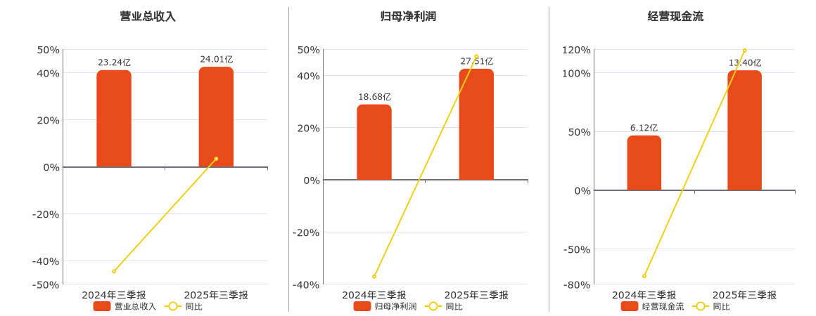 公司营业总收入为24.01亿元,较去年同报告期营业总收入增加7780.68万元,同比较去年同期上涨3.35%。归母净利润为27.51亿元,较去年同报告期归母净利润增加8.83亿元,同比较去年同期上涨47.26%。经营活动现金净流入为13.40亿元,较去年同报告期经营活动现金净流入增加7.28亿元,同比较去年同期上涨118.88%。