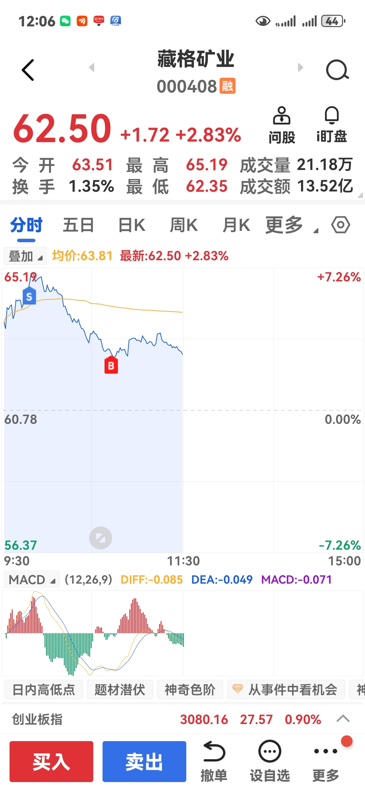 $藏格矿业(SZ000408)$ 今天持股2418天,前面说了站稳62三天有效站稳我会加仓中,不然就减仓。仅供参考不做推荐,今天64.99被吃,很犹豫,62.38又接回来。文明用语,谢谢。