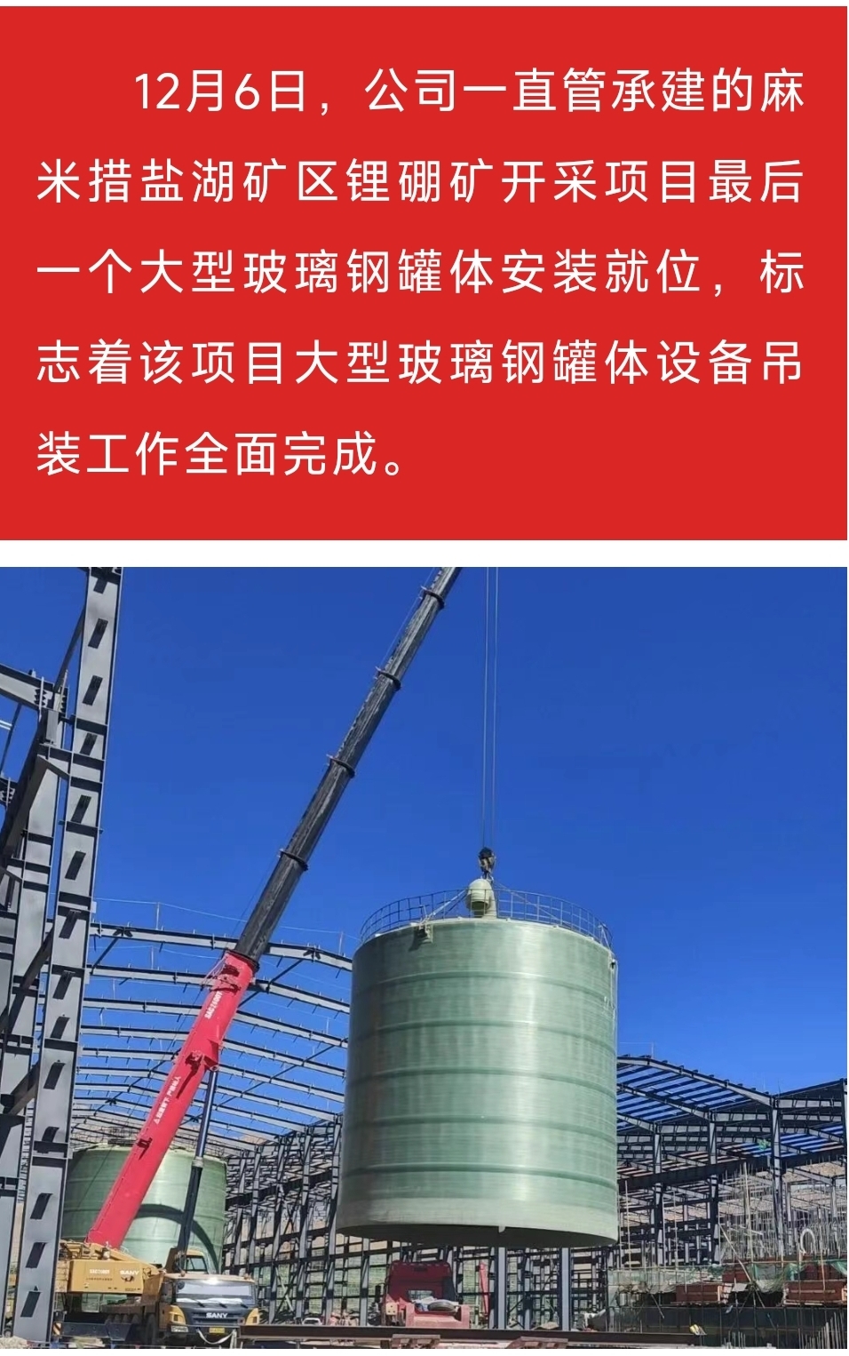 $藏格矿业(SZ000408)$ 奋战80天 决胜全年度丨公司麻米措盐湖矿区锂硼矿开采项目大型玻璃钢罐体设备吊装完成