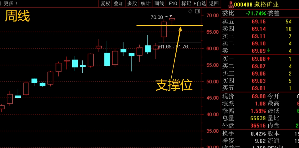 $藏格矿业(SZ000408)$ 中期走得很强,连续拉升并且没有明显的震荡回调走势,这里直接看周线图就行,横线位置,也就是本周低点作为防守位看待,能稳住问题不大,有效跌破仓位重的就考虑减一些应对不确定风险即可,趋势明朗,就不用折腾太多。