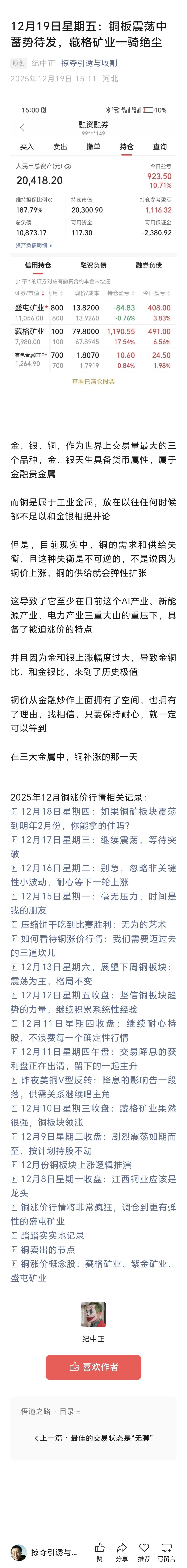 $藏格矿业(SZ000408)$ $盛屯矿业(SH600711)$ $江西铜业(SH600362)$ 12月19日星期五:铜板震荡中蓄势待发,藏格矿业一骑绝尘
