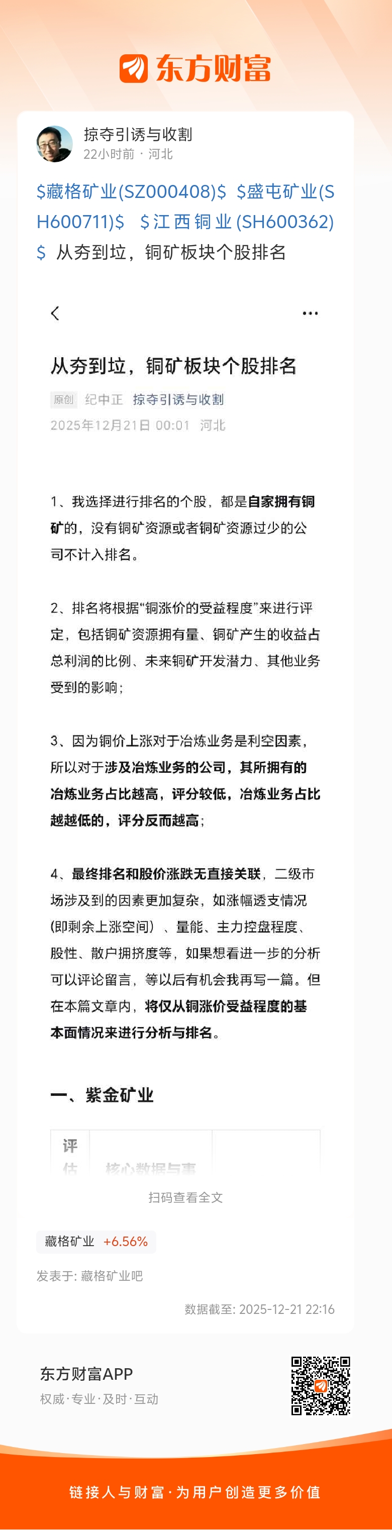 $藏格矿业(SZ000408)$  $盛屯矿业(SH600711)$  $江西铜业(SH600362)$  从夯到垃,铜矿板块个股排名