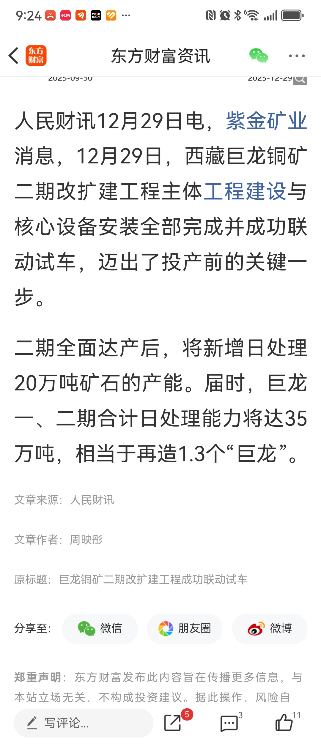 $藏格矿业(SZ000408)$ 巨龙铜矿二期改扩建工程设备安装完毕并成功联动试车,迈出投产前关键一步!