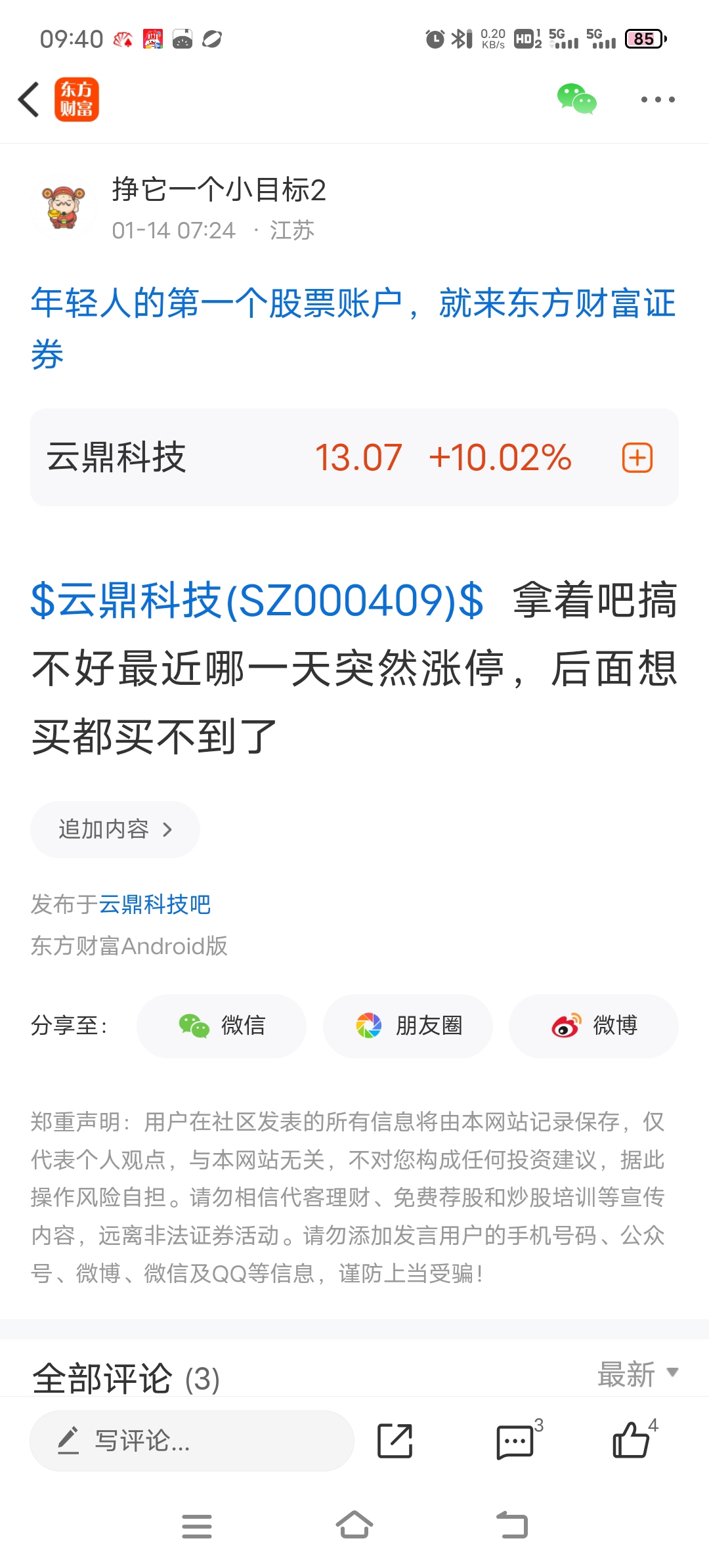 温馨提示: 1.根据《证券法》规定,禁止编造、传播虚假信息或者误导性信息,扰乱证券市场;2.用户在本社区发表的所有资料、言论等仅代表个人观点,与本网站立场无关,不对您构成任何投资建议。用户应基于自己的独立判断,自行决定证券投资并承担相应风险。《东方财富社区管理规定》