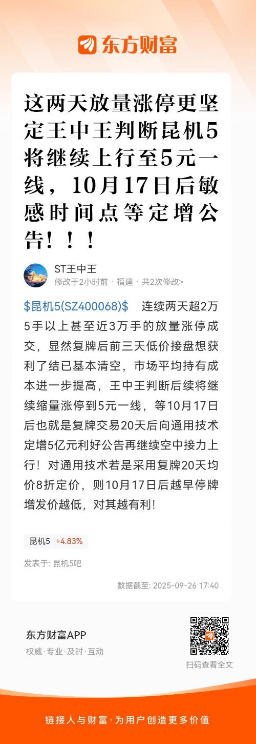 $昆机5(SZ400068)$ 连续两天超2万5手以上甚至近3万手的放量涨停成交,显然复牌后前三天低价接盘想获利了结已基本清空,市场平均持有成本进一步提高,王中王判断后续将继续缩量涨停到5元一线,等10月17日后也就是复牌交易20天后向通用技术定增5亿元利好公告再继续空中接力上行!对通用技术若是采用复牌20天均价8折定价,则10月17日后越早停牌增发价越低,对其越有利!
