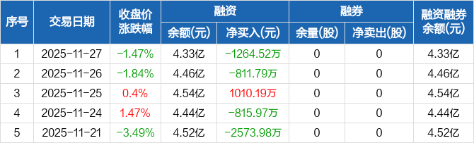 沈阳机床:融资净偿还1264.52万元,融资余额4.33亿元(11-27)
