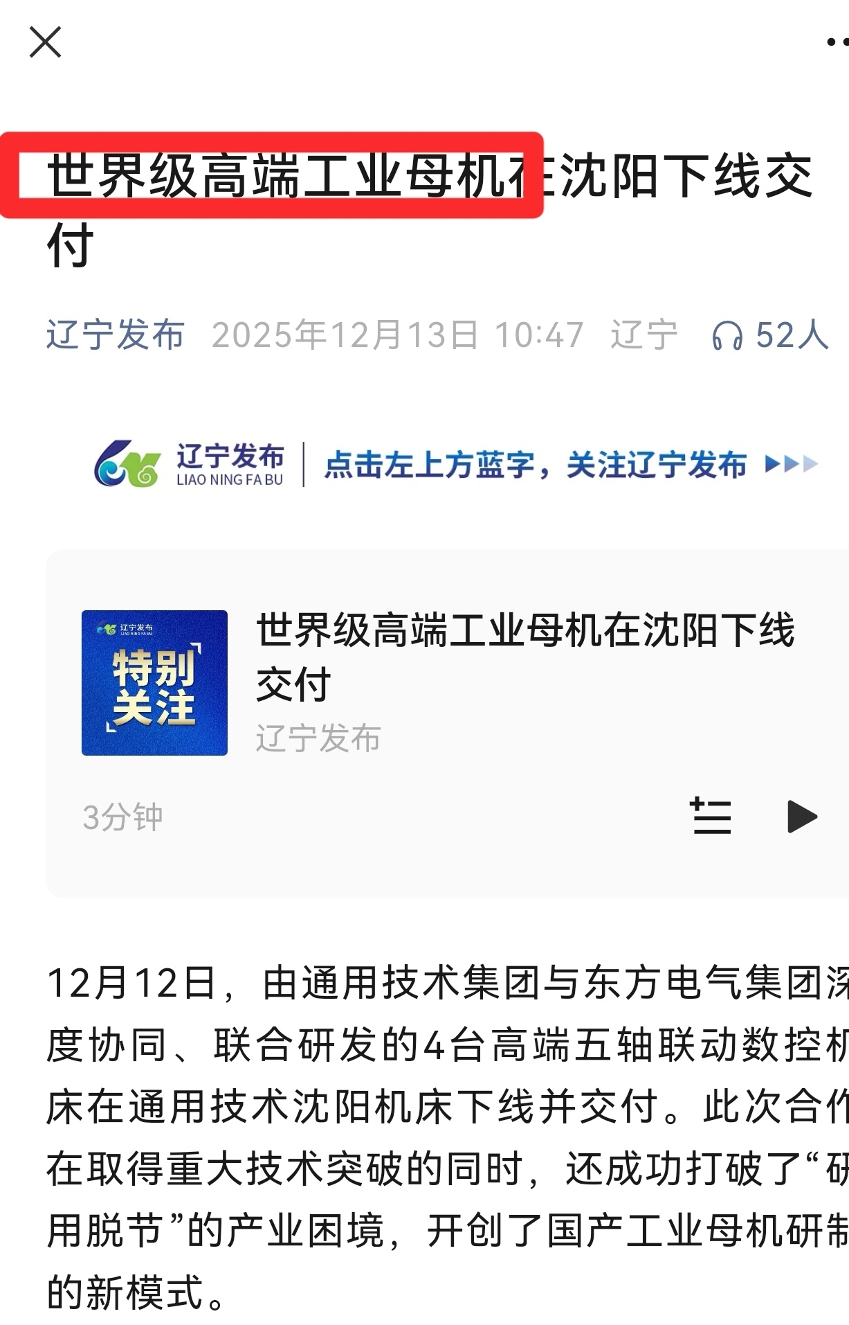 辽宁省人民政府办公厅,定义为世界级工业母机。