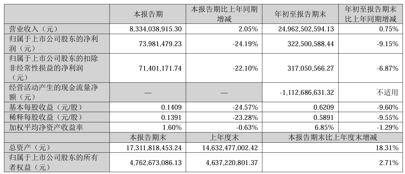 其中,第三季度,公司营业收入为83.34亿元,同比上升2.05%;归母净利润为7398.15万元,同比下降24.19%;扣非归母净利润为7140.12万元,同比下降22.10%。