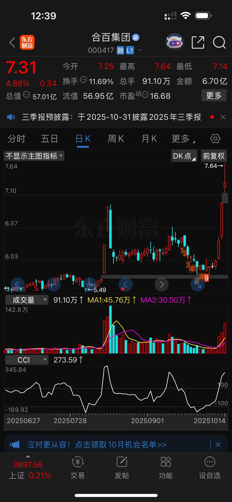 $合百集团(SZ000417)$ 大商,萧老二都去哪儿了?,这盘面去大婶出来指导啊:这半天11%的换手率,走出一根十字星~~这上午走势是出货图形?还是洗盘图形?