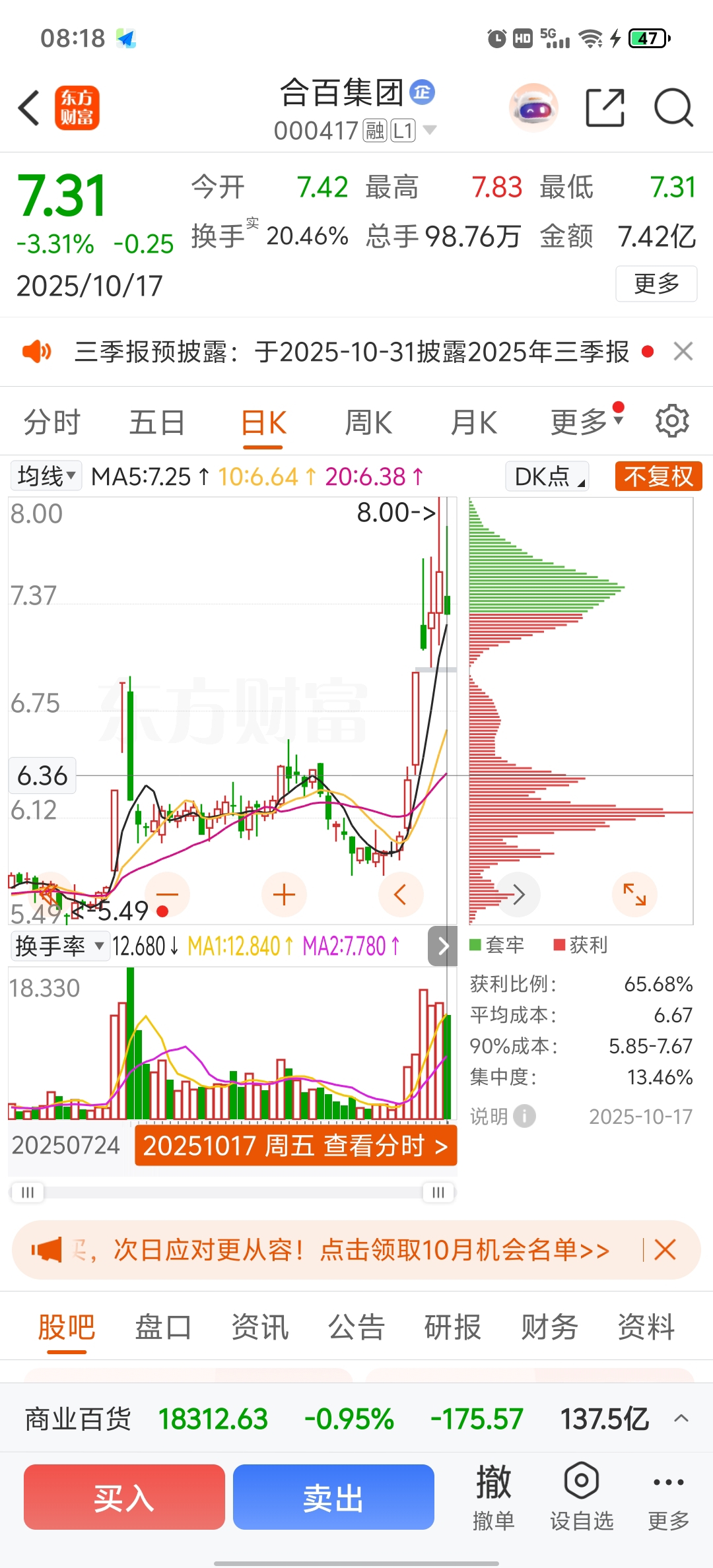 $合百集团(SZ000417)$ 短线,波段收割完结片,接下来,开始磨洗,这部分追进去新韭菜,回落,这手法,这么多年没变,估计会到6.3左右,半年线,依然等待指数继续调整
