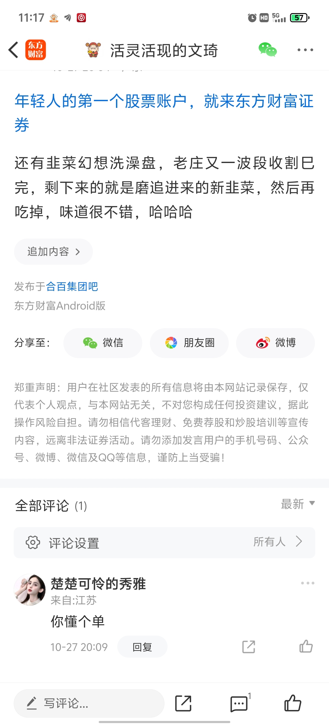 $合百集团(SZ000417)$ 评我的那位,不知道套牢没有,哈哈哈,合肥百货这庄股你玩了多少年,明摆的波段收割,,真正主浪还上串下跳,一群托唱多,回头让你们买?,老庄壳子进水了吗,能主浪的股,还有什么散户,就算边拉边涨,也是短站的洗盘,看看这里全是散户,不割韭菜,老庄有榴莲吃吗,有茅台吗,
