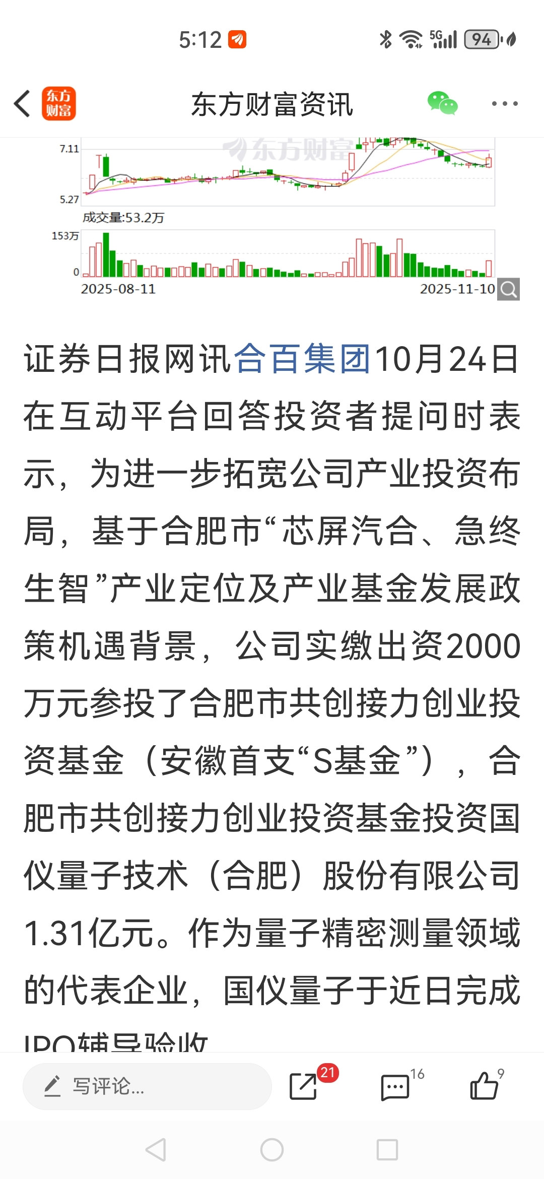 长鑫存储合百集团投了1.8亿,这个量子2千万。还有北京史河高空机器人,合肥新美新材料,株洲中车半导体。港股智慧医疗,合肥合光光掩膜。浙江中能类脑。还有已经投资的金太阳充电桩,已经赚了8千万的宁波银行消银。合百集团对外投资已经占市值的五分之一了。创投利润未来将改变合百集团企业性质!