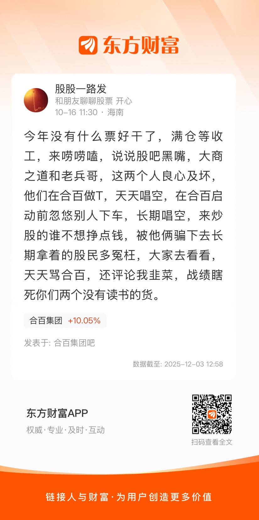 今年没有什么票好干了,满仓等收工,来唠唠嗑,说说股吧黑嘴,大商之道和老兵哥,这两个人良心及坏,他们在合百做T,天天唱空,在合百启动前忽悠别人下车,长期唱空,来炒股的谁不想挣点钱,被他俩骗下去长期拿着的股民多冤枉,大家去看看,天天骂合百,还评论我韭菜,战绩瞎死你们两个没有读书的货。