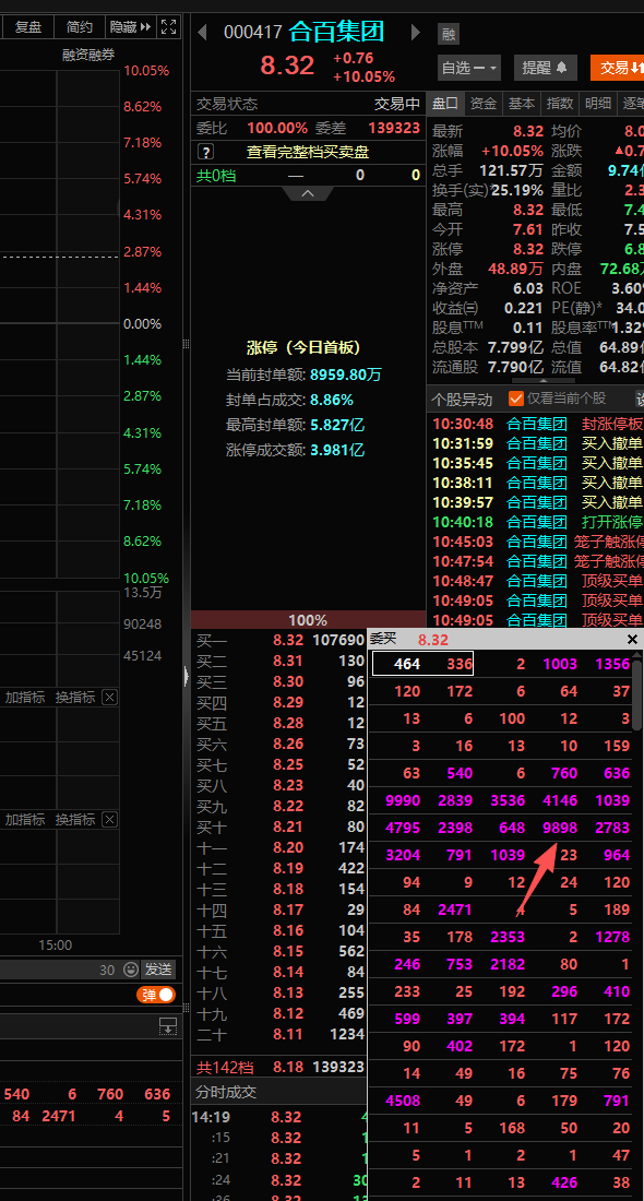 $合百集团(SZ000417)$ 下午的时候看了一下封单,有一个9898手。但是这笔单子最后是主动撤的并没有成交。陈小群板上出货?