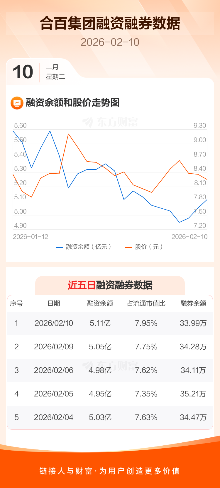 交易所最新数据显示,合百集团于2026年2月10日获融资买入3397.10万元,融资偿还2747.95万元,当日融资净买入649.14万元。目前,该股融资余额5.11亿,占流通市值比例为7.95%。