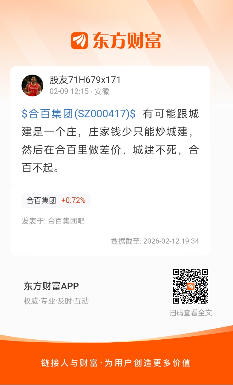 $合百集团(SZ000417)$  有可能跟城建是一个庄,庄家钱少只能炒城建,然后在合百里做差价,城建不死,合百不起。