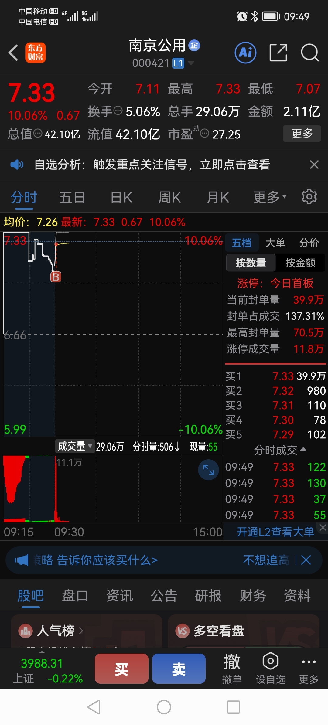 $南京公用(SZ000421)$ 集合竞价就看到这个了。,奈何没有子弹,只能等昨天的清仓。半路拿下这个。