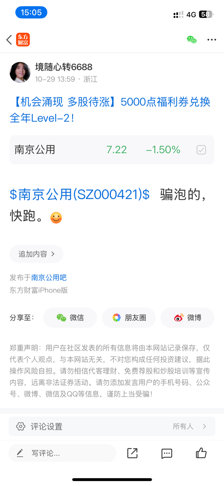 温馨提示: 1.根据《证券法》规定,禁止编造、传播虚假信息或者误导性信息,扰乱证券市场;2.用户在本社区发表的所有资料、言论等仅代表个人观点,与本网站立场无关,不对您构成任何投资建议。用户应基于自己的独立判断,自行决定证券投资并承担相应风险。《东方财富社区管理规定》