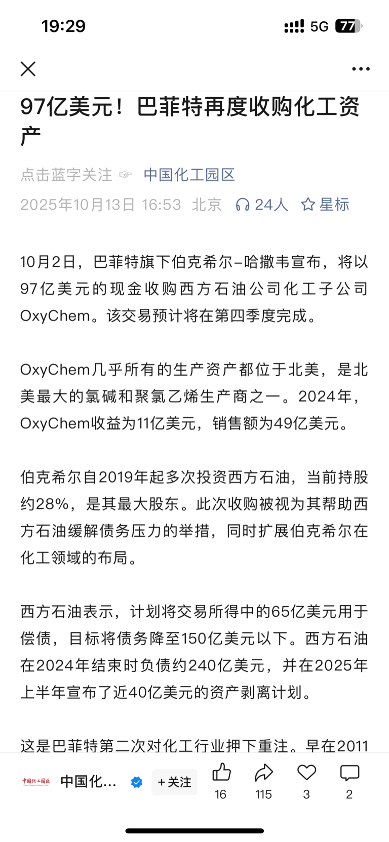 10月2日,97亿美元现金收购的消息震惊全球资本市场——巴菲特旗下伯克希尔-哈撒韦宣布将拿下西方石油子公司OxyChem,这家北美顶级氯碱与聚氯乙烯生产商,瞬间让沉寂的化工赛道成为焦点。这已是股神第二次对化工行业豪掷百亿,早在2011年他就收购了特种化学品企业路博润。当市场还在解读其布局逻辑时,深谙"抄作业"精髓的投资者已将目光转向A股——这里的氯碱聚氯乙烯龙头,在成本控制、产业链布局与成长潜力上,丝毫不输OxyChem。