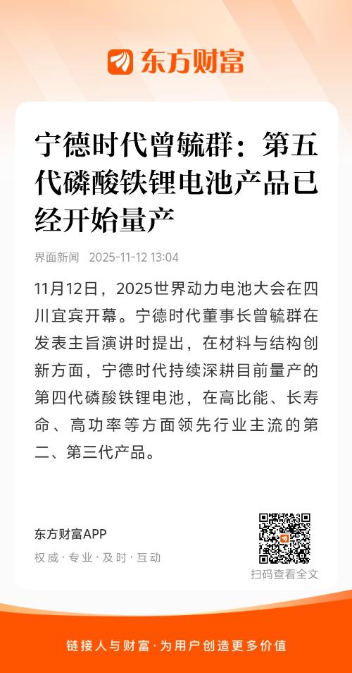 11月12日,2025世界动力电池大会在四川宜宾开幕。宁德时代董事长曾毓群在发表主旨演讲时提出,在材料与结构创新方面,宁德时代持续深耕目前量产的第四代磷酸铁锂电池,在高比能、长寿命、高功率等方面领先行业主流的第二、第三代产品。