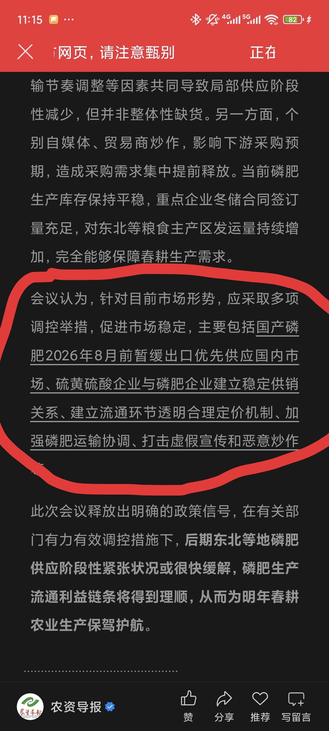 $湖北宜化(SZ000422)$ 磷肥暂停出口,算是一个大利空吧,如果主力因为磷肥保供而暂停出口,进而影响业绩而砸承担保供任务企业的股票,就太不是东西了。