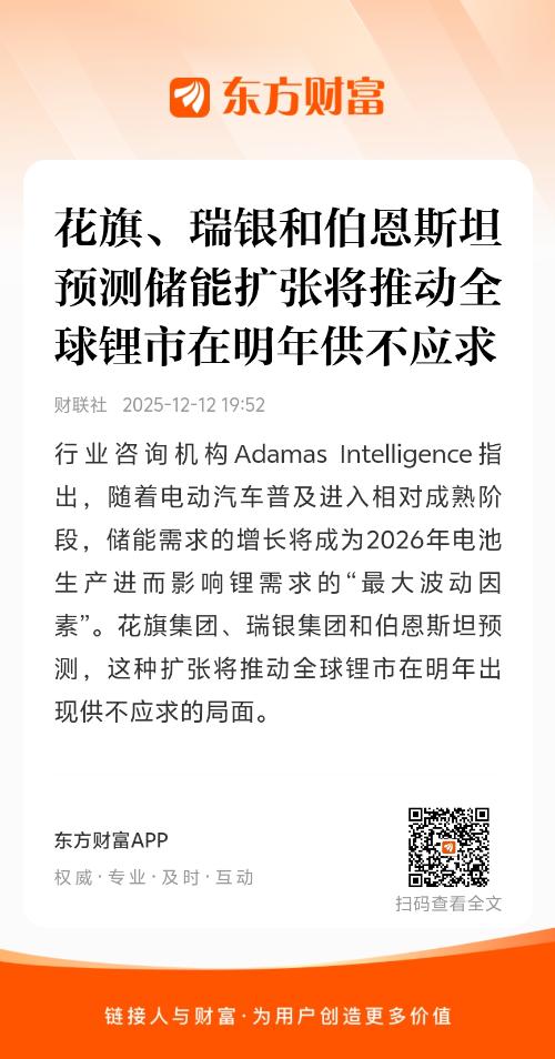 行业咨询机构Adamas Intelligence指出,随着电动汽车普及进入相对成熟阶段,储能需求的增长将成为2026年电池生产进而影响锂需求的“最大波动因素”。花旗集团、瑞银集团和伯恩斯坦预测,这种扩张将推动全球锂市在明年出现供不应求的局面。储能领域对锂的需求明年可能增长55%,远超电动汽车领域19%的增幅。