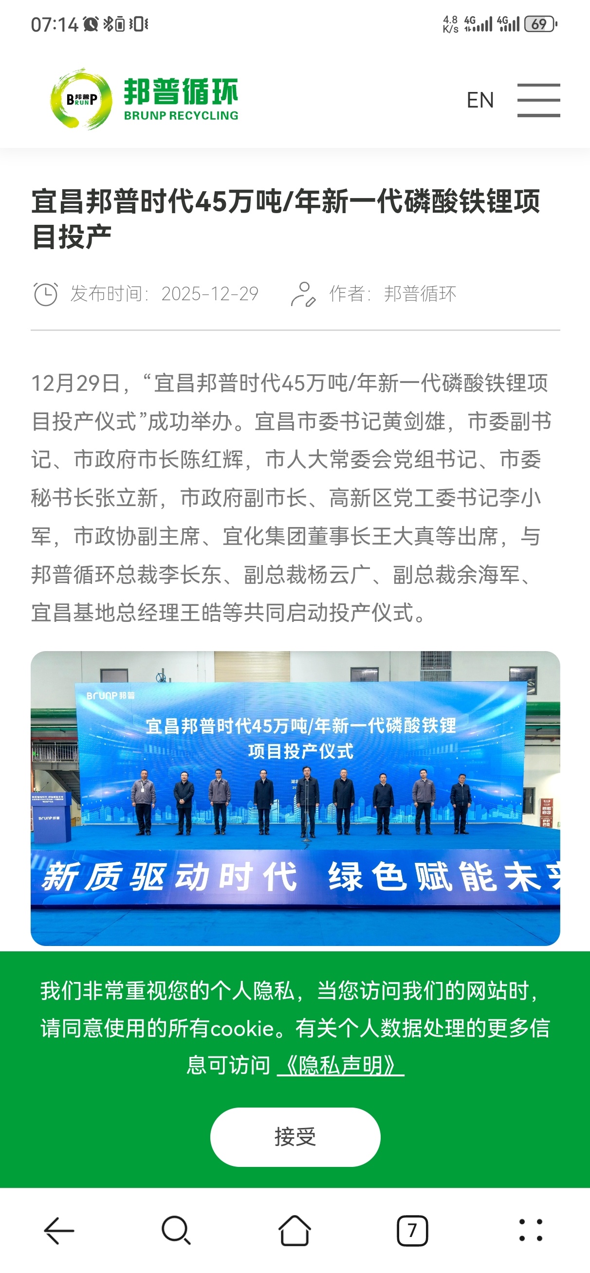 与宁德时代合作的电池材料投产,宁德时代(全球电池龙头)的控股公司,邦普时代负责电