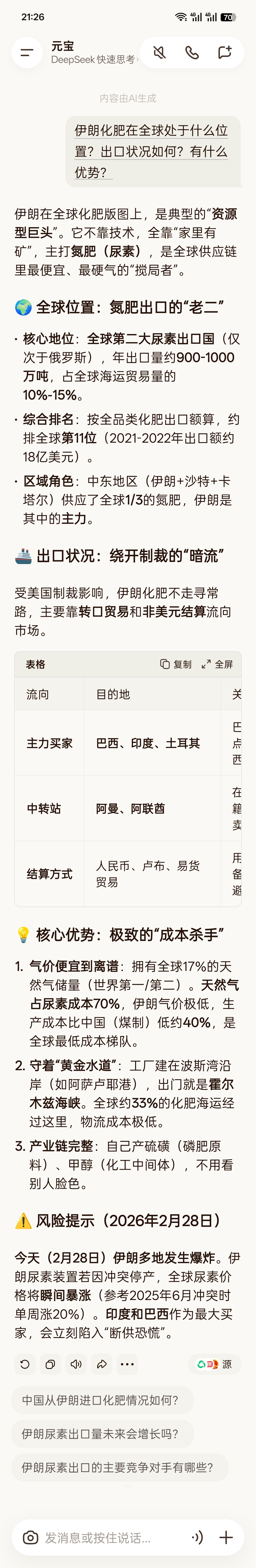 $湖北宜化(SZ000422)$ $云天化(SH600096)$ 伊朗战争利好化肥。周一涨停。