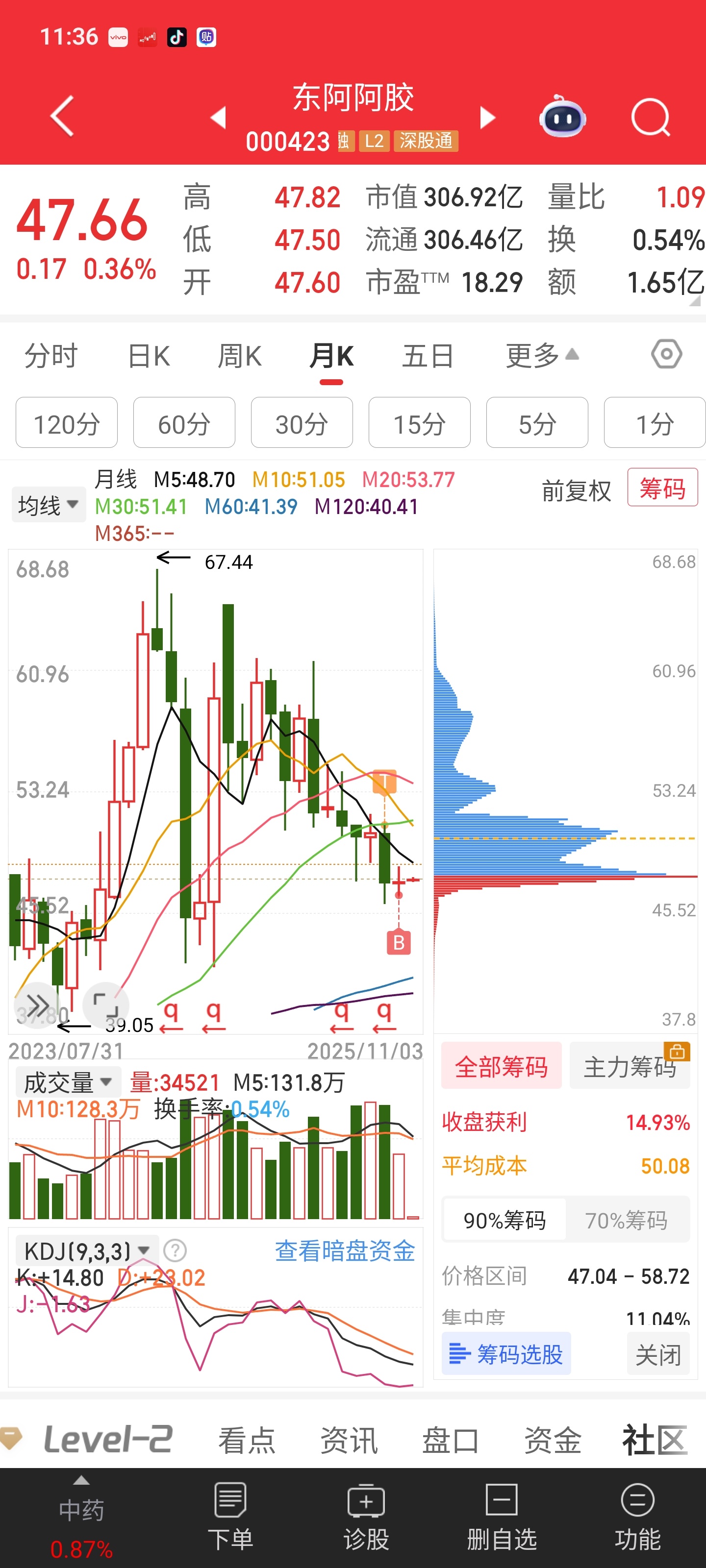 $东阿阿胶(SZ000423)$ 就这筹码分布,短时间内根本别想拉了,53以上的筹码几乎都割肉了。要想洗筹码早就吸够了,现在是根本没啥增量资金来