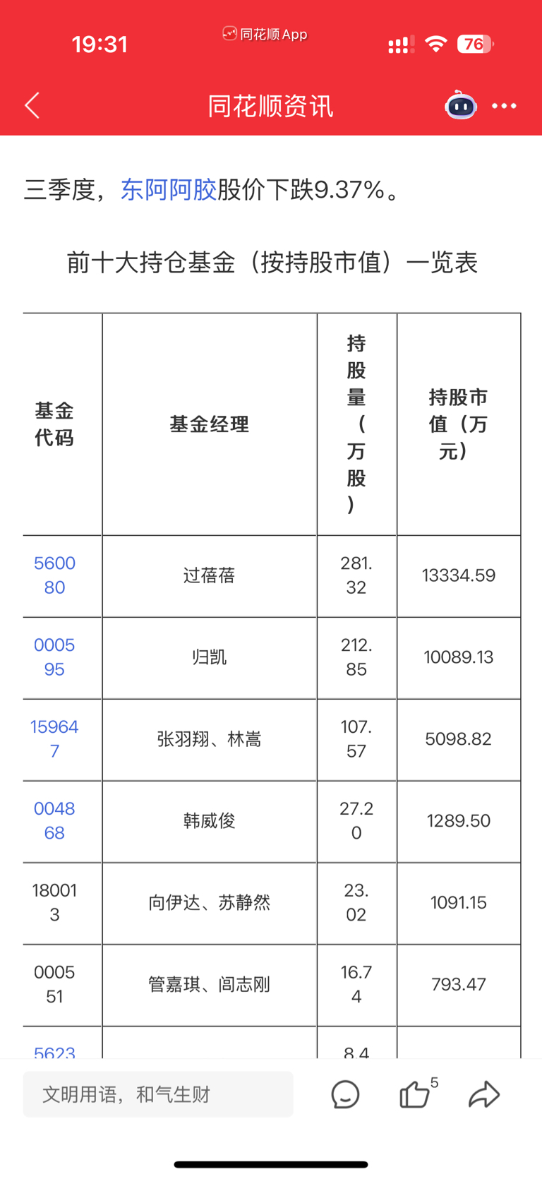 $东阿阿胶(SZ000423)$ 基金就3个亿在里面,4季度应该回来