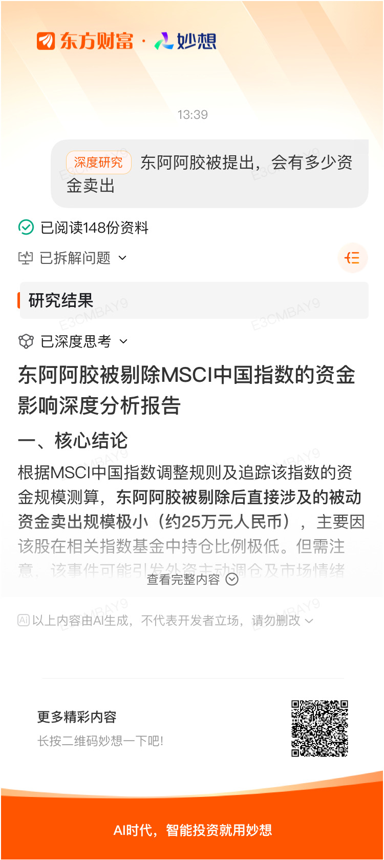 #@妙想,你怎么看?# 妙想一下:东阿阿胶被提出,会有多少资金卖出