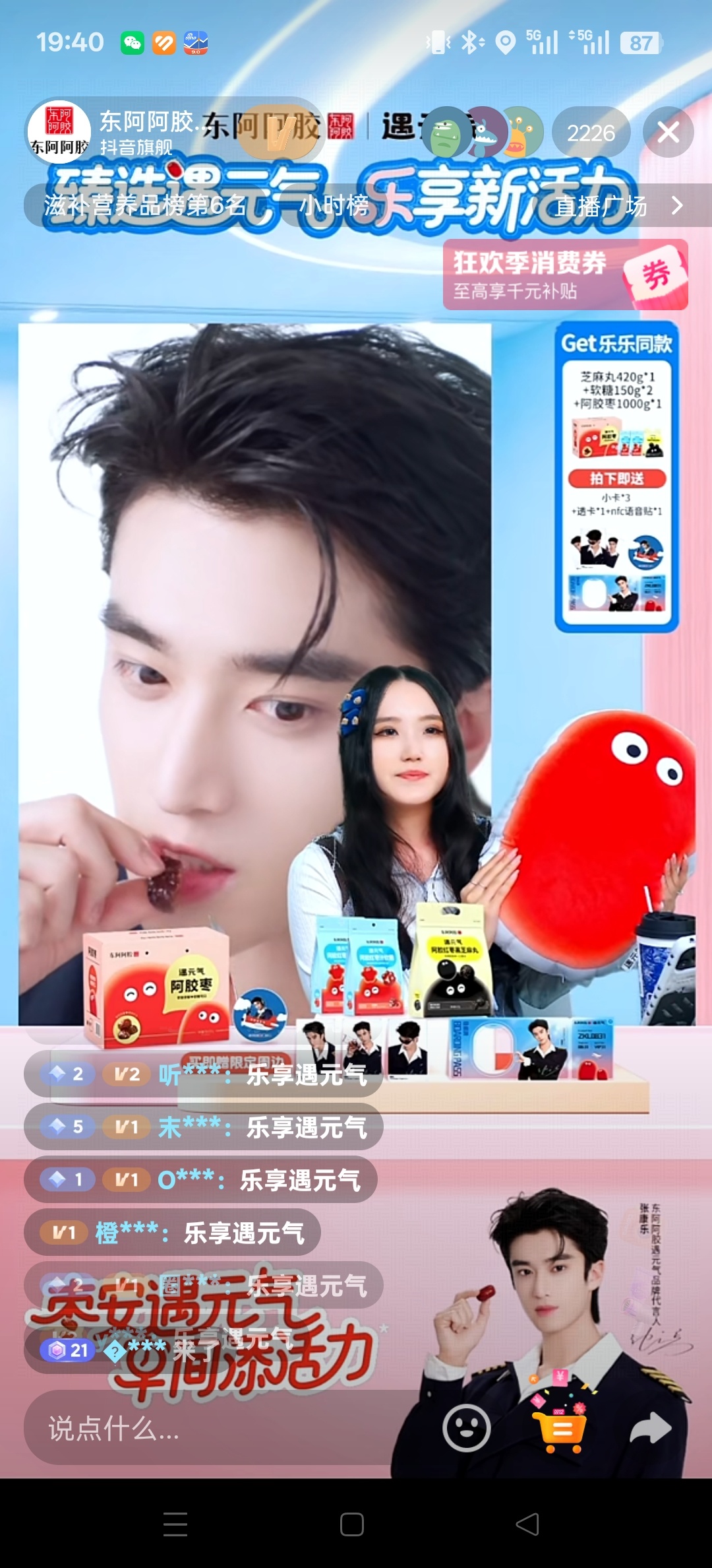 遇元气阿胶枣代言人张康乐今晚八点钟,要在东阿阿胶营养膳食旗舰店抖音直播间开播了预
