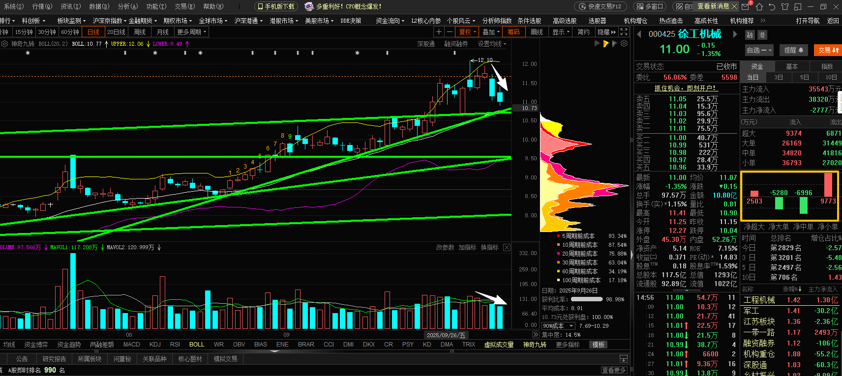 $徐工机械(SZ000425)$ 筹码稳的,量价健康,短期调整而已,不要搞得像庄家活不过明天一样,跑啥跑啊,人家很在意仓位管理的好吧,不是全仓 all in 没有后续输出,人家是一进一出,波浪上行,一有点风吹草动就出货。出啥货,筹码都还在,量能也没有放的特别大。这个股走的就是稳步上行,短期调整可以先出了,企稳再进来。