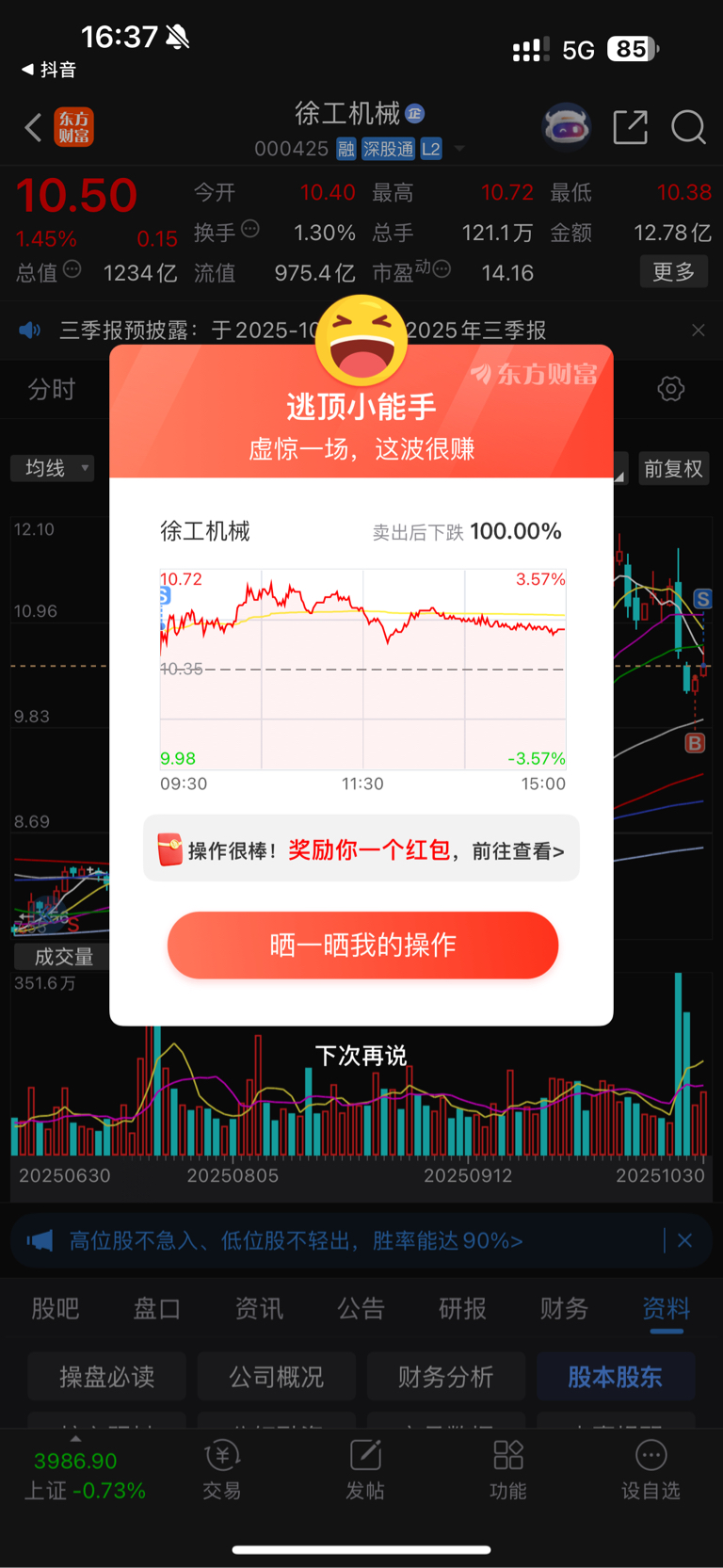 $徐工机械(SZ000425)$ 卖出后下跌100%可还行