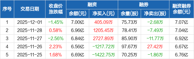 融资方面,当日融资买入4776.41万元,融资偿还4371.31万元,融资净买入405.09万元,连续3日净买入累计4338.43万元。融券方面,融券卖出5.03万股,融券偿还7.71万股,融券余量75.73万股,融券余额770.17万元。融资融券余额合计7.07亿元。