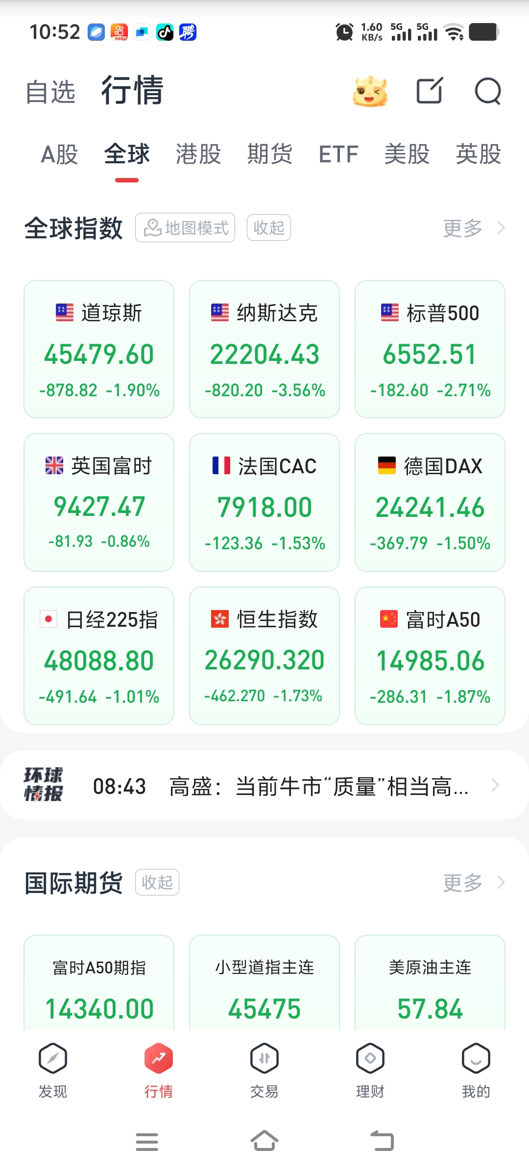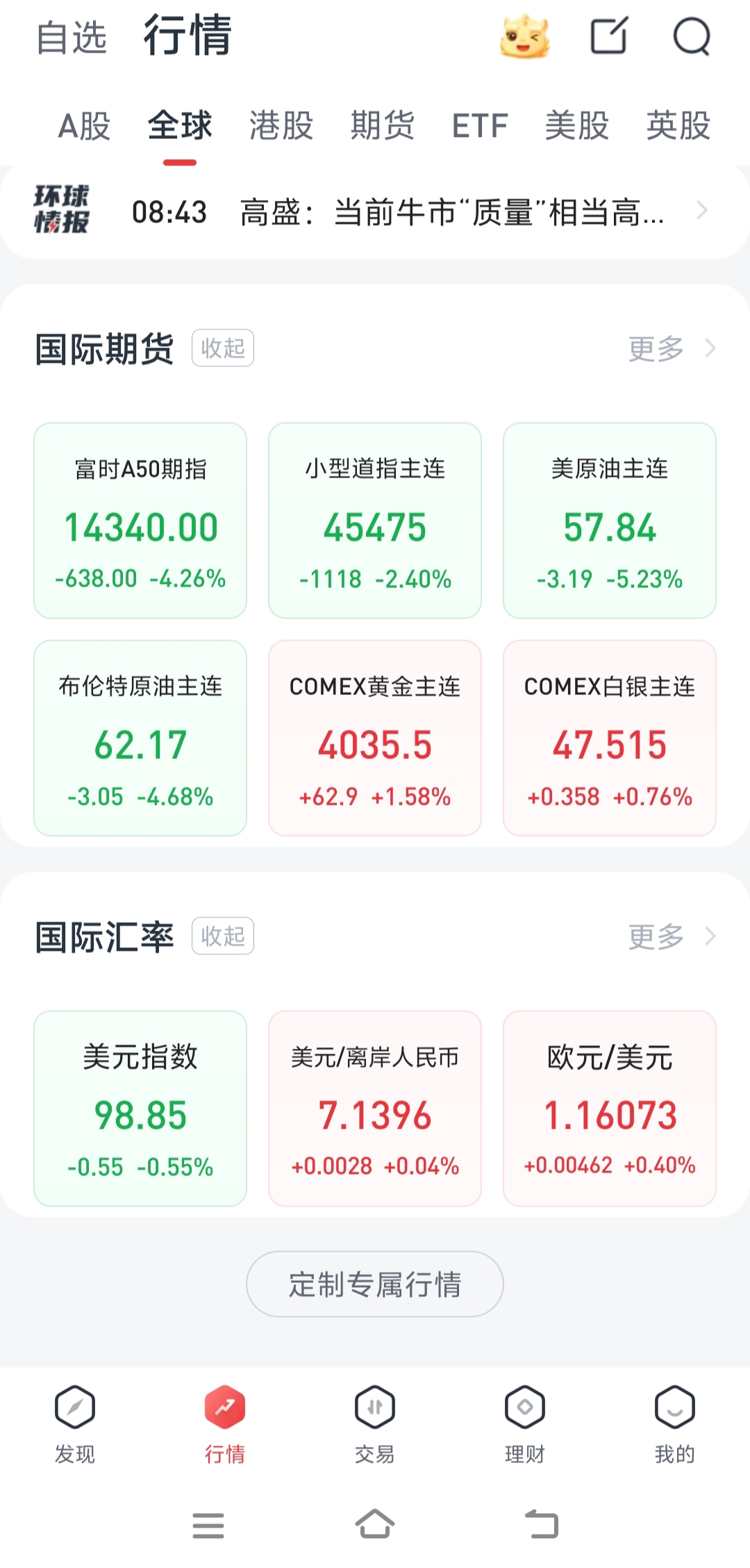 外围股指全线大跌翻绿,只有国际期货黄金,白银是红的。