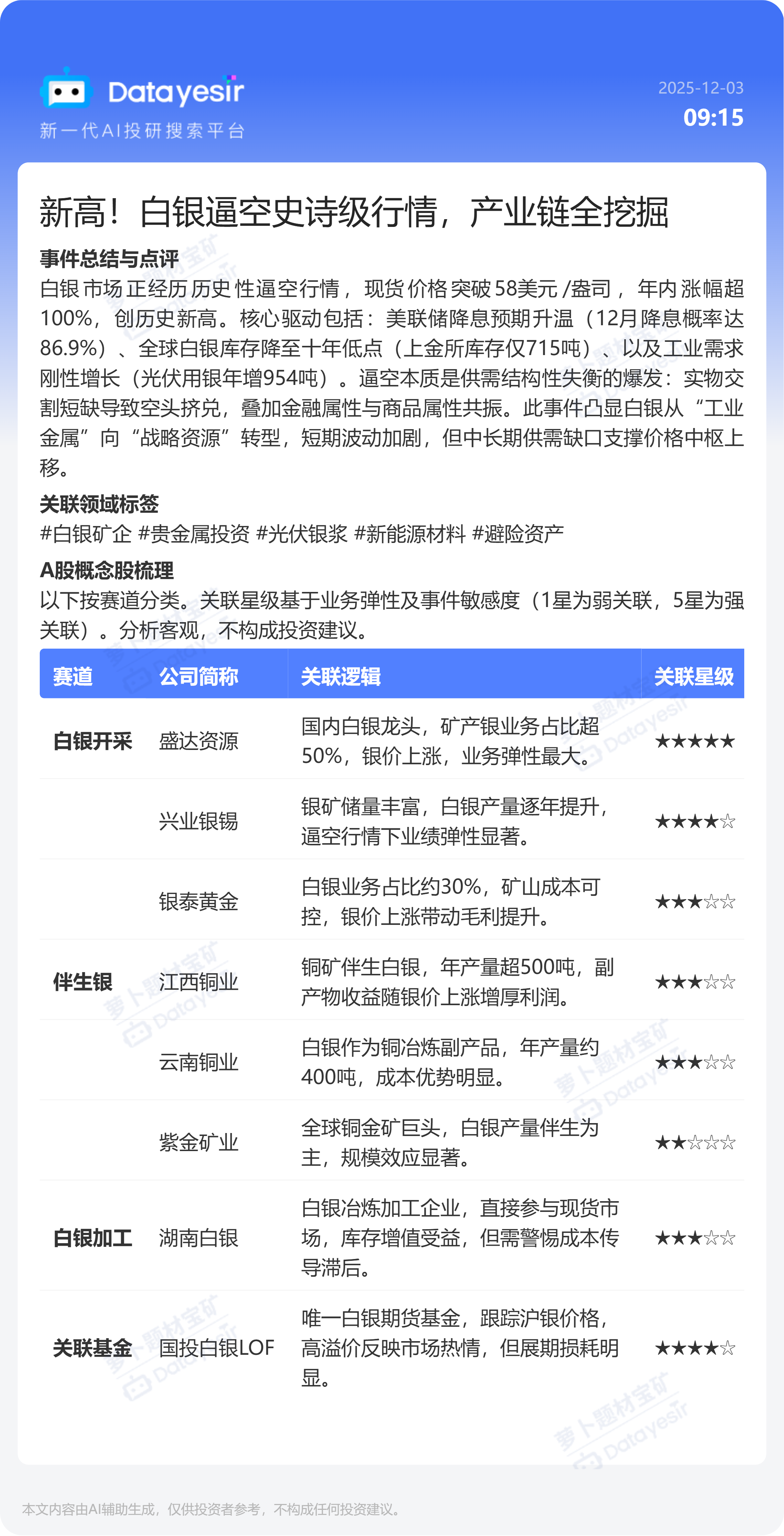 白银市场正经历历史性逼空行情,现货价格突破58美元/盎司,年内涨幅超100%,创历史新高。此事件凸显白银从“工业金属”向“战略资源”转型,短期波动加剧,但中长期供需缺口支撑价格中枢上移。