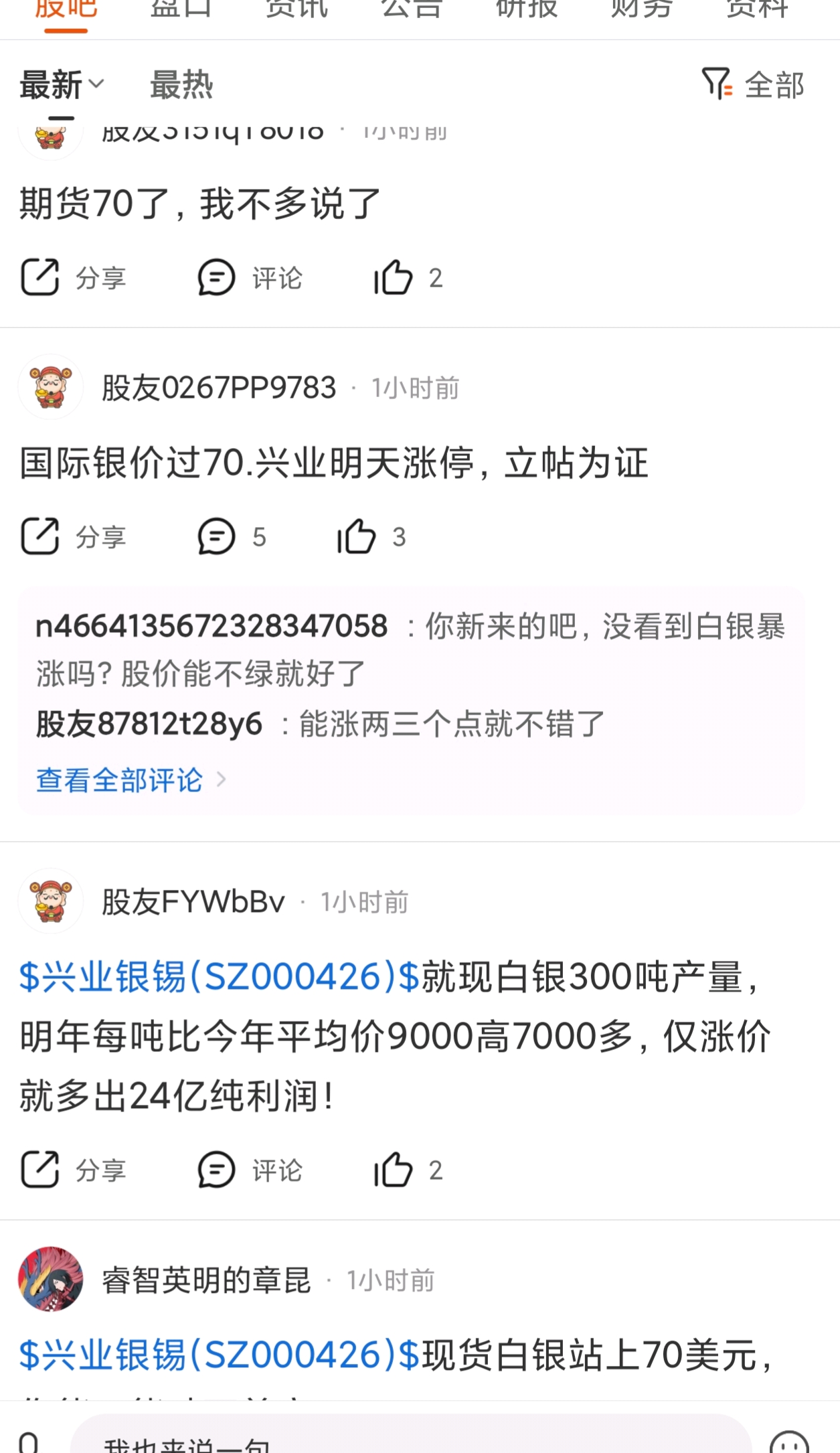 评论区又疯狂了,早上白银都冲过70了,现在又激动了,莎紫太多了,唉,这个票真的会