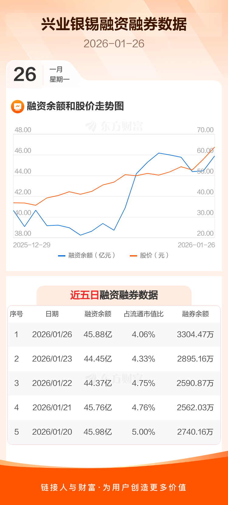 交易所最新数据显示,兴业银锡于2026年1月26日获融资买入7.58亿元,融资偿还6.15亿元,当日融资净买入1.42亿元。目前,该股融资余额45.88亿,占流通市值比例为4.06%。