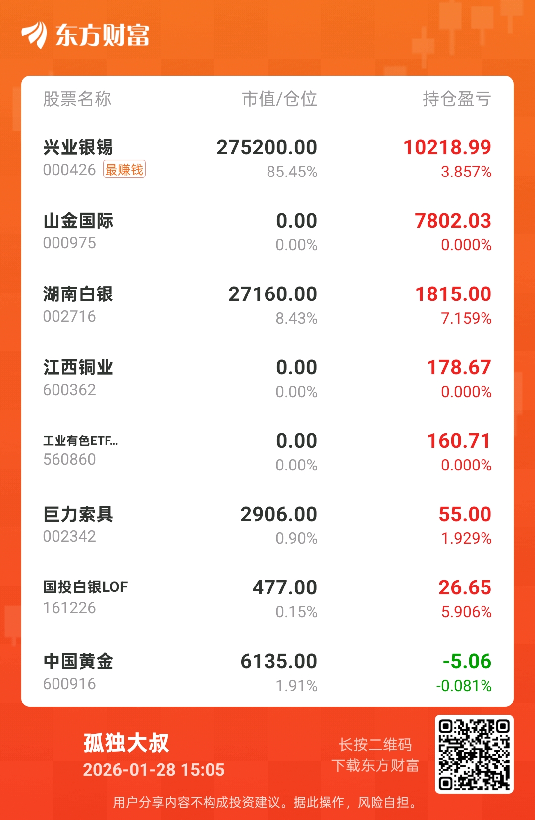 今天感觉不错 今天的操作拉满了 ,全部红了,14:45还上车巨力索具了,尾盘2分钟拉涨停板 让我捡漏了(刚好我浏览巨力索具页面时看到突然放量好多),估计巨力索具估计要开启主升浪行情了,除了山金国际操作失误了,其他的股票感觉明天大概率上涨甚至是连板涨停,早上竞价进了中国黄金,当时没想到买进,就挂单6000块,买少了,因为前几天我想买湖南黄金时 我挂涨停价一直买不进去,我目前的思路是主玩白银黄金,有好的(像巨力索具,江西铜业等)股票感觉他会涨,少资金玩玩,低买高卖来回做t