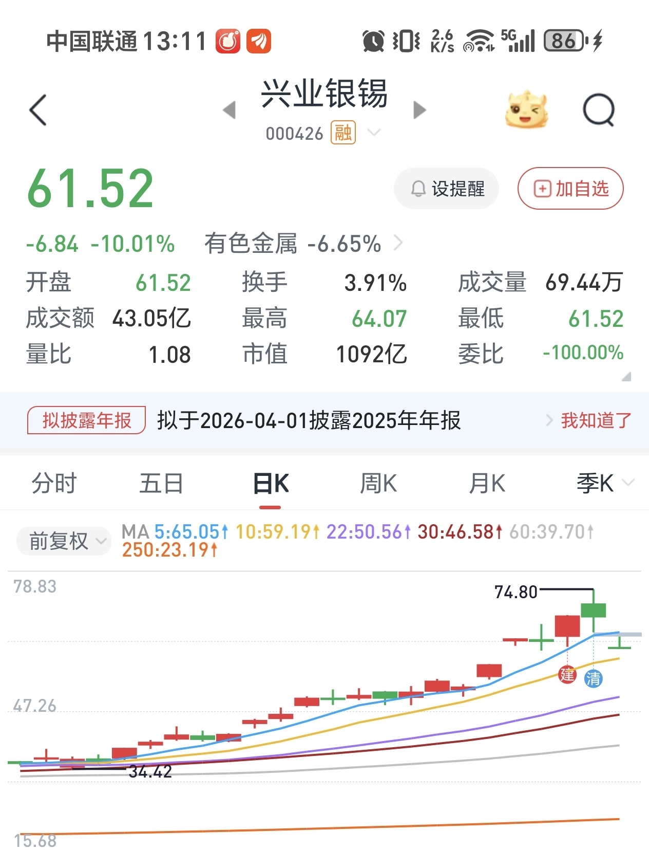 $兴业银锡(SZ000426)$ 吃一口就跑