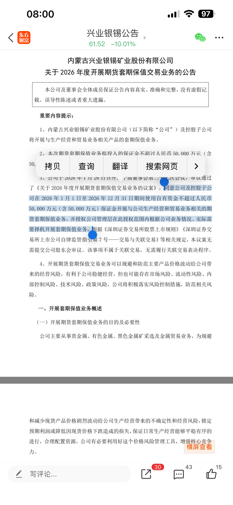 $兴业银锡(SZ000426)$ 5亿资金,26年1月份起套期保值!这波操作稳了!!!尽管周一大概率跌停开盘,但不得不说老板还是有点长远眼光的,居安思危,这波被他装到